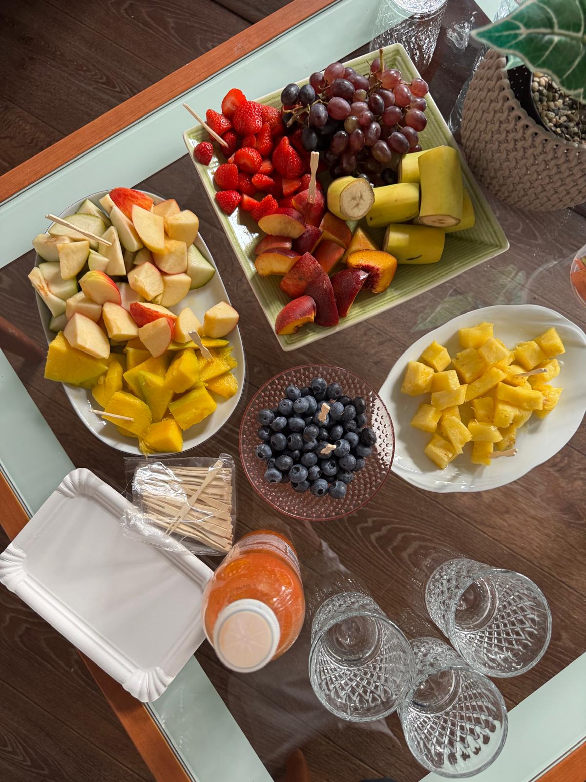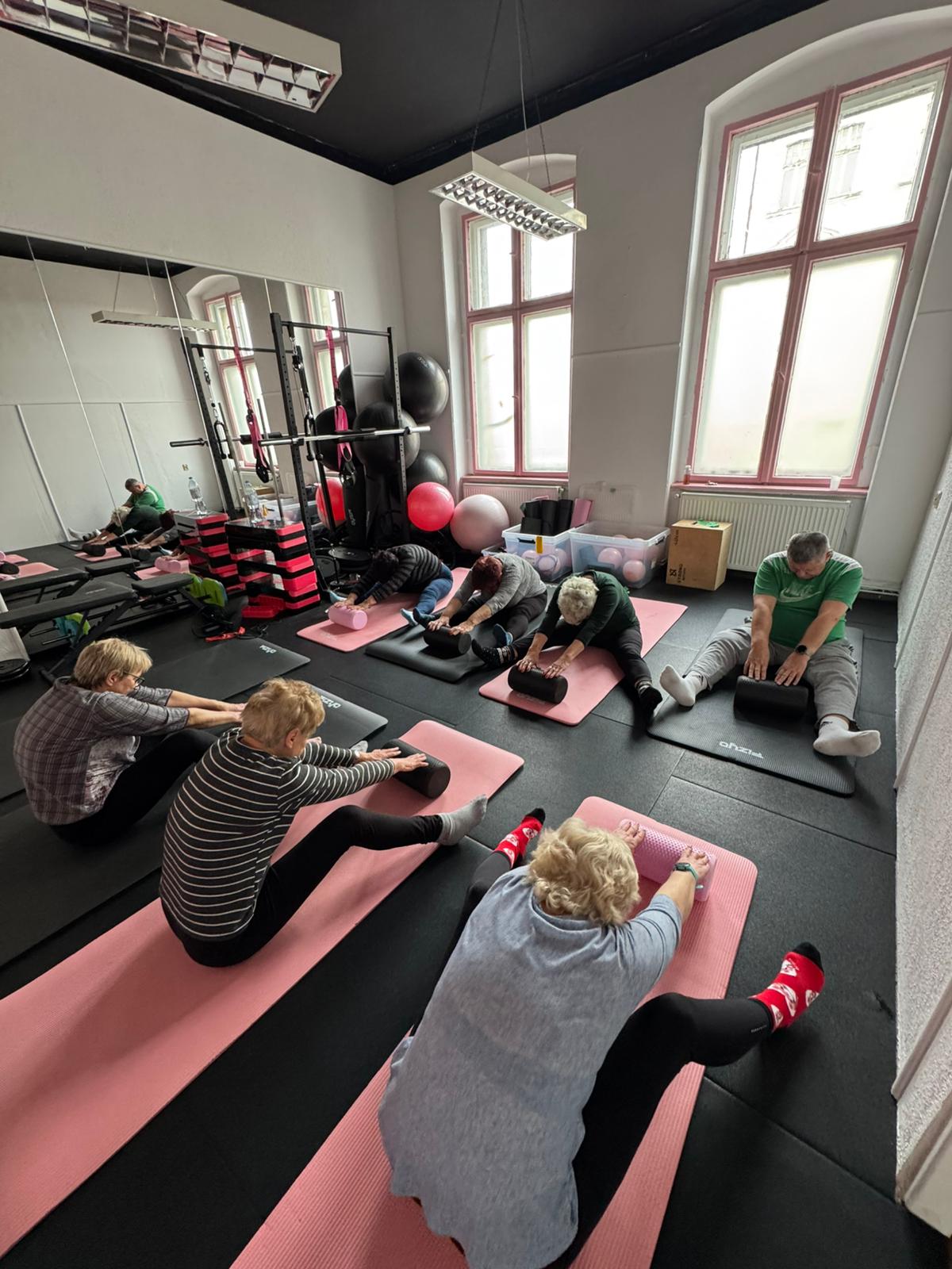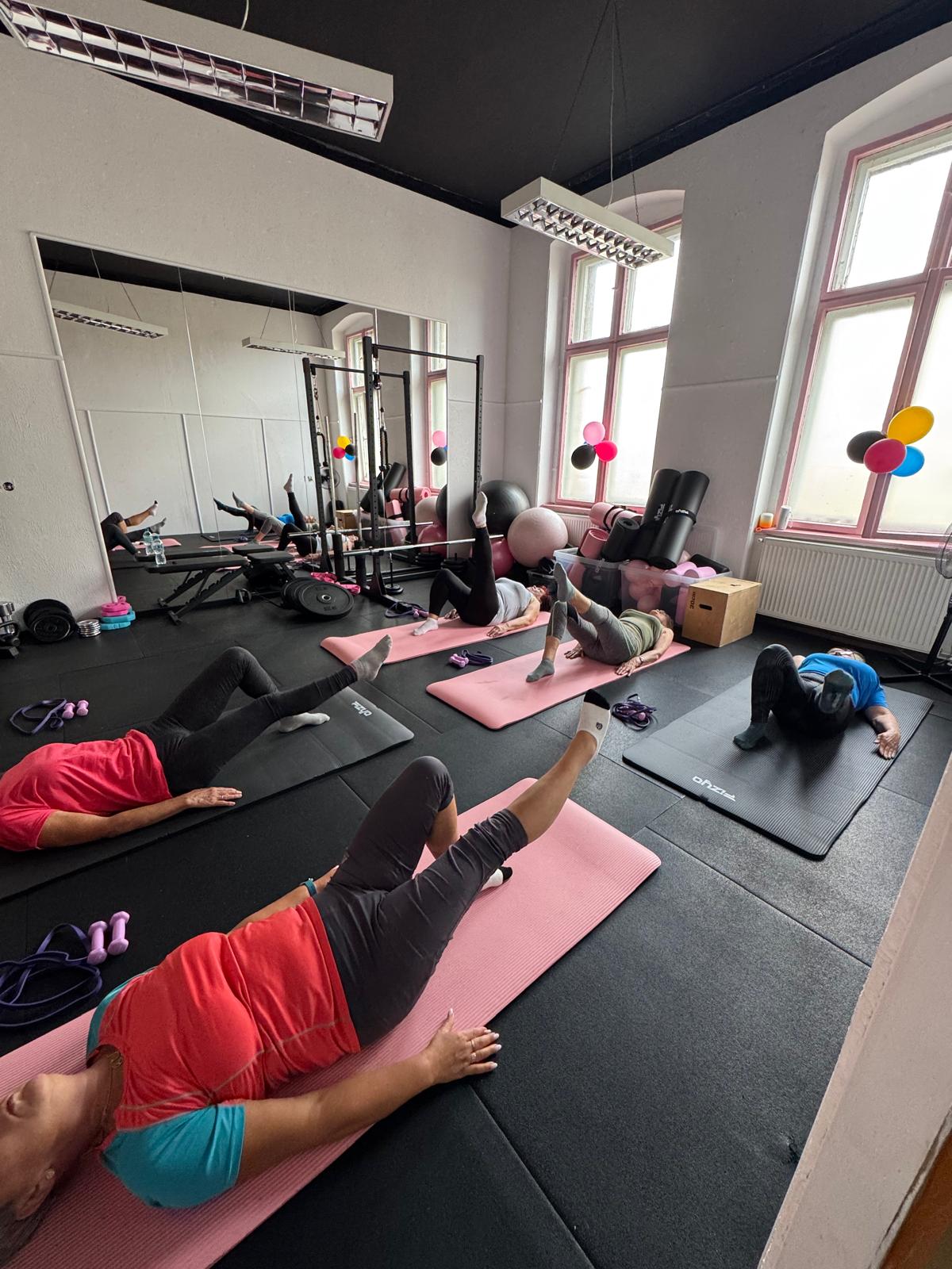 📅 Spotykaliśmy się 5 razy w tygodniu, po 1,5 godziny dziennie, w dwóch 10-osobowych grupach. Ćwiczyliśmy w spokojnym tempie, przy użyciu lekkiego sprzętu – piłek, hantli i stepów. Był też czas na przerwę, nawodnienie i regenerację – czekały świeże owoce, soki i woda.